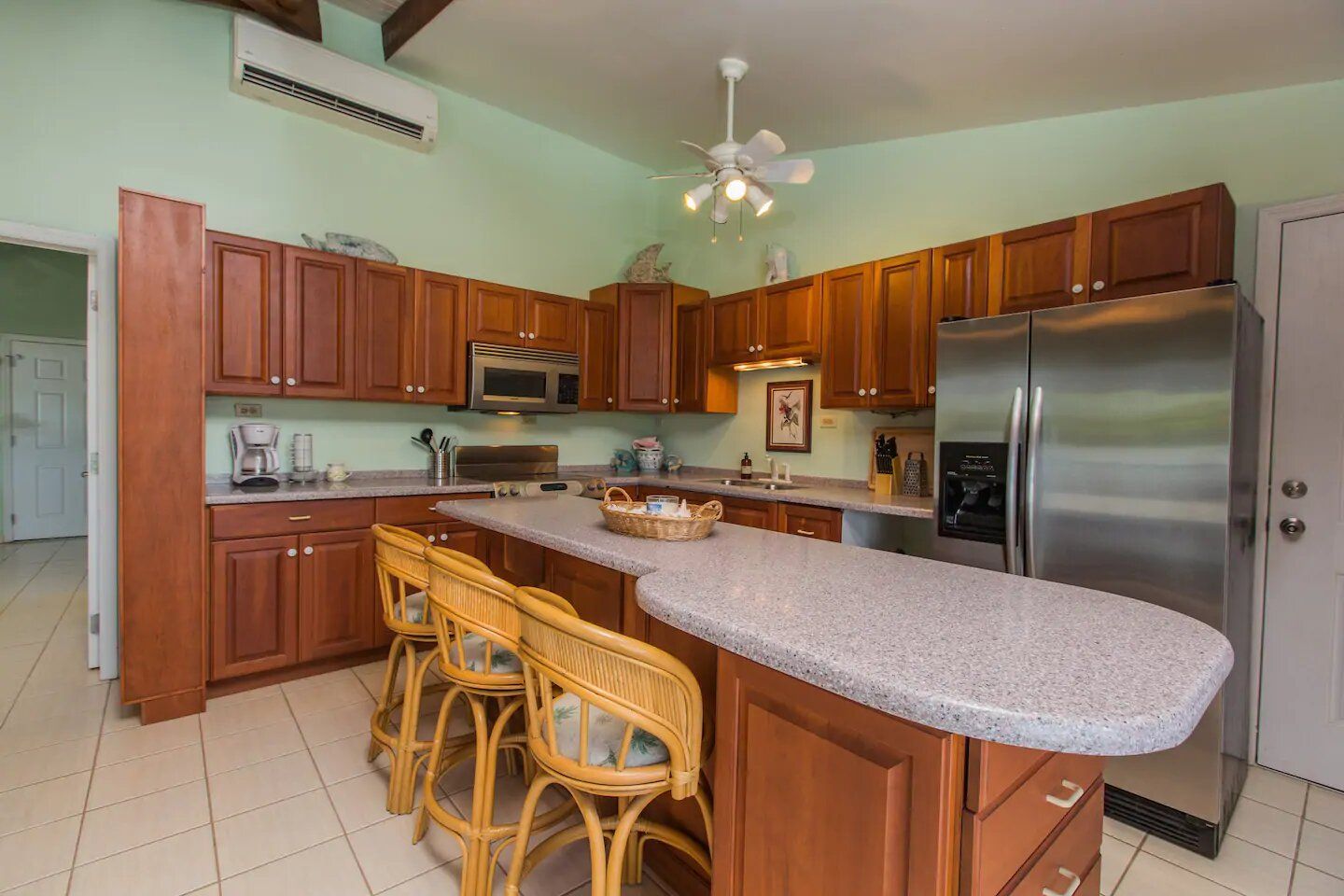 The Frangipani Suite is a custom designed & finished one-bedroom executive suite located on the Island side of the Villa in the northwest corner, offering beautiful ocean & sunset views from its private balcony. As can be seen from the pictures included with this listing the Frangipani Suite is well-constructed with vaulted beamed ceilings and tile floors and has powerful A/C.