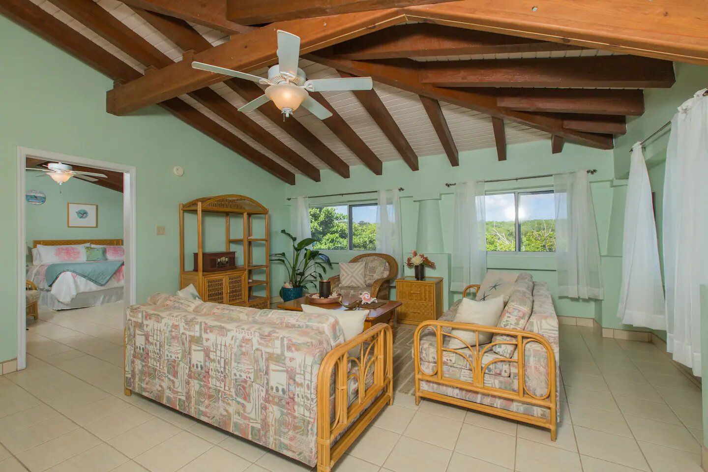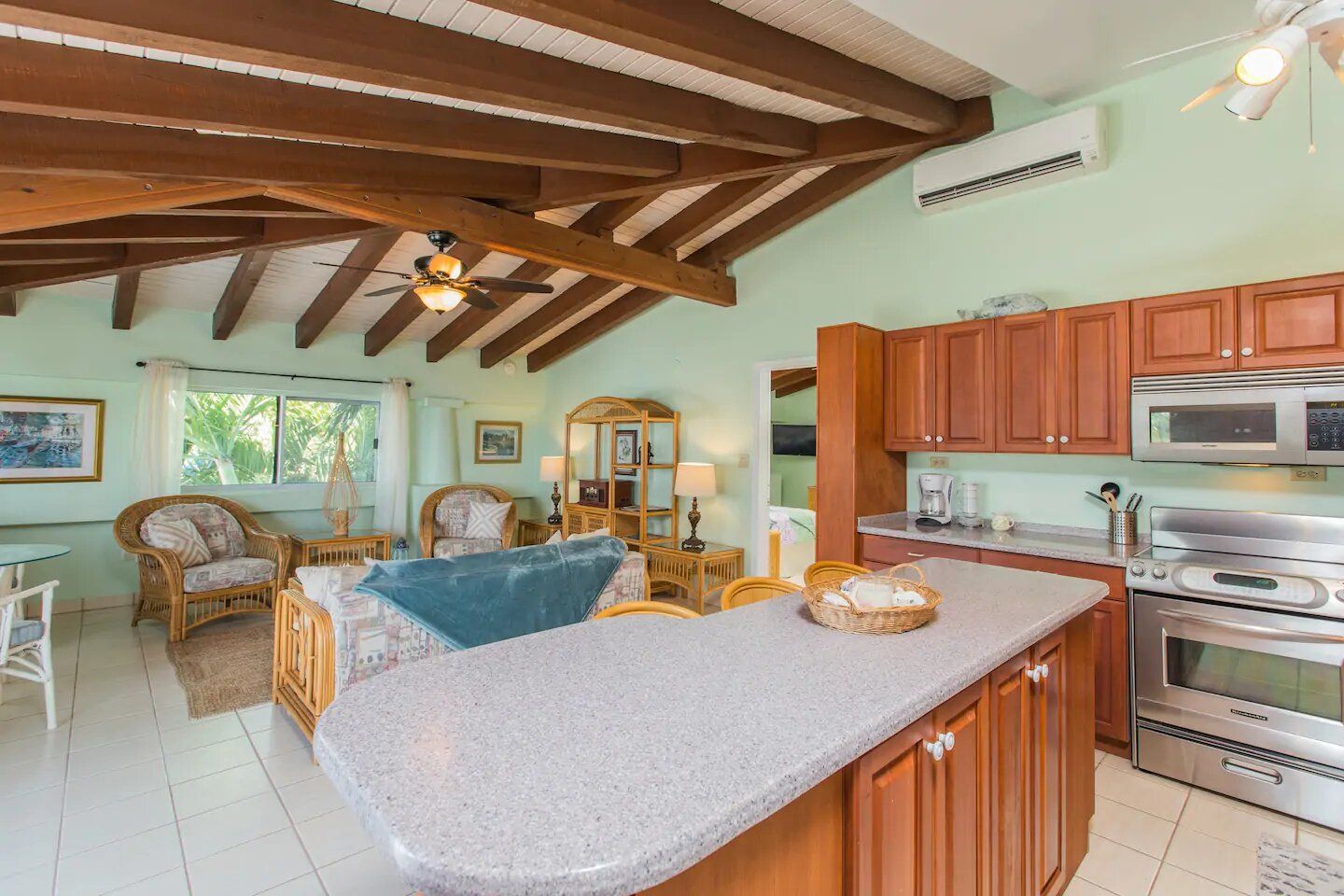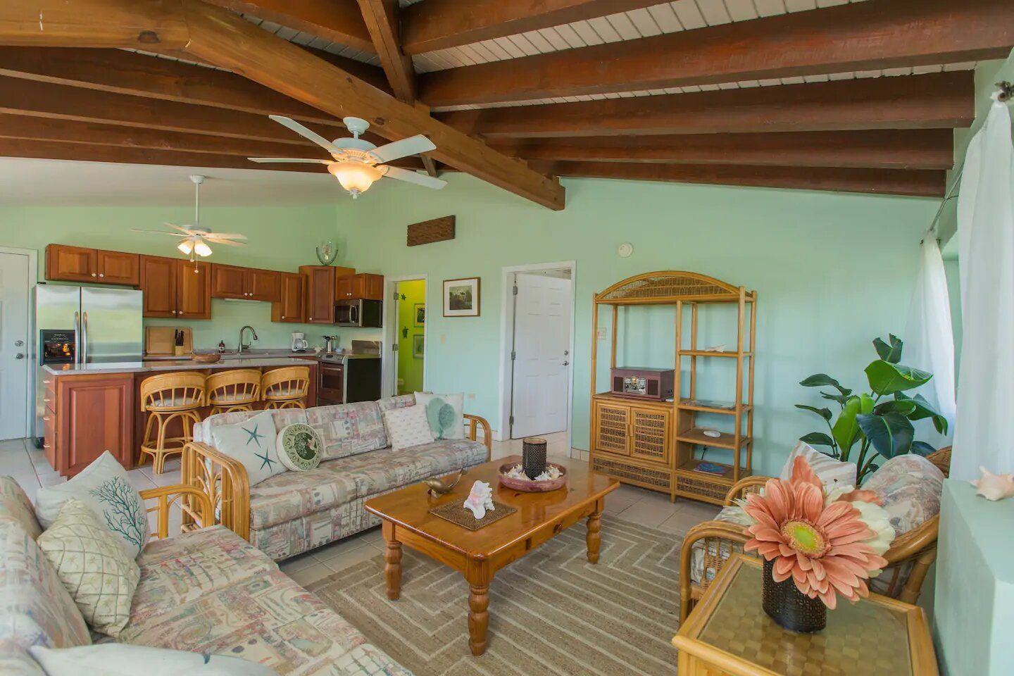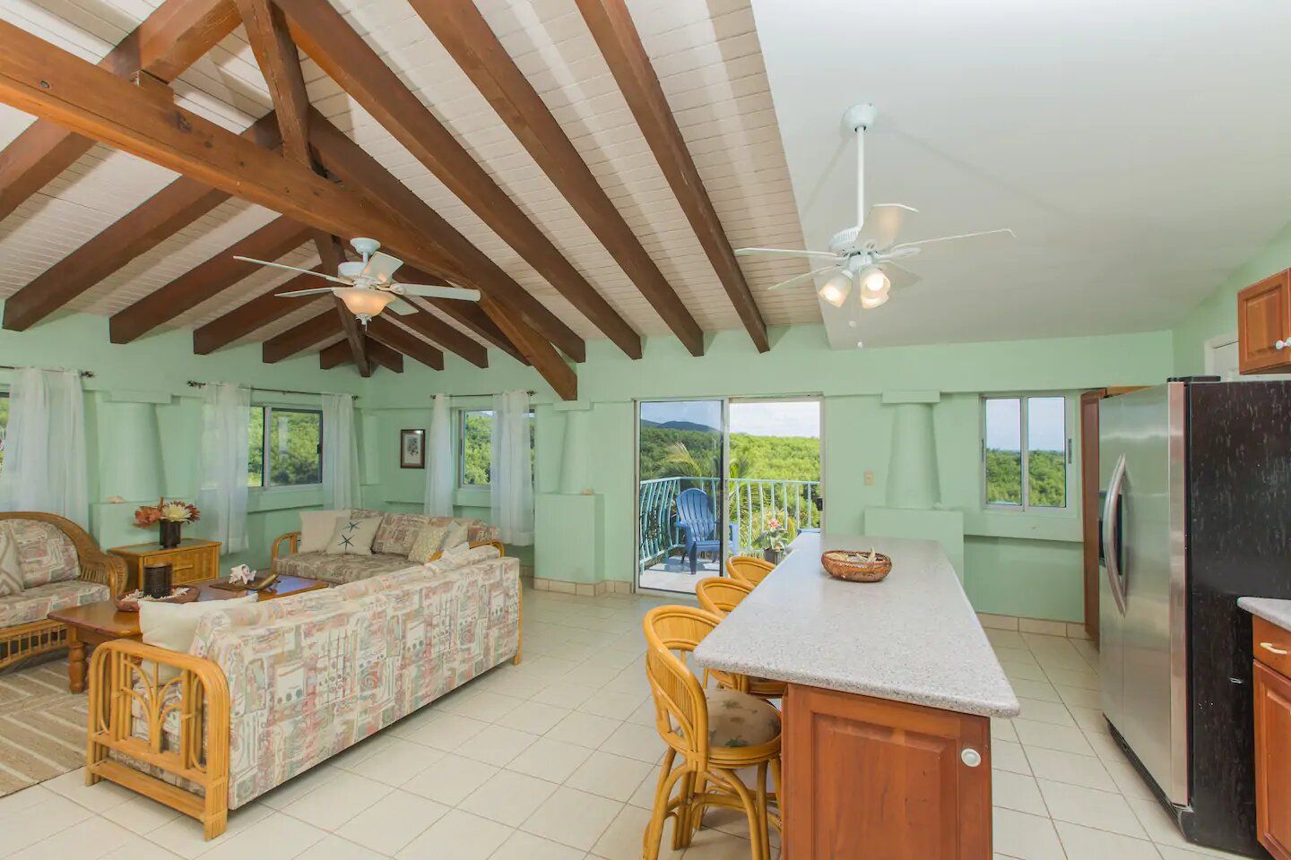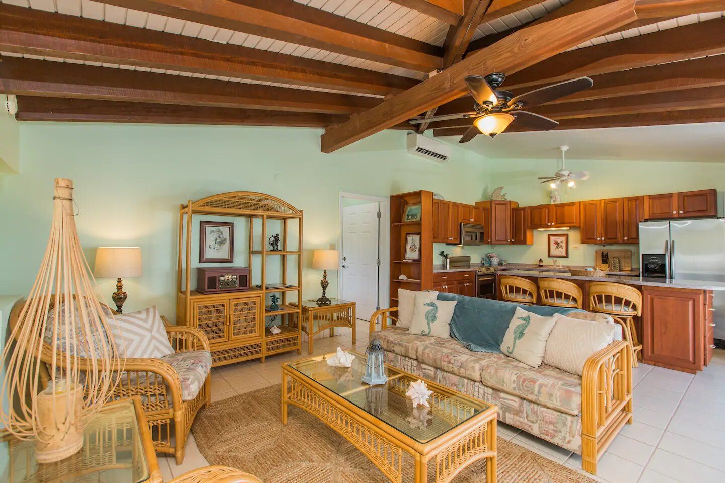 The six residences on the second floor of the Villa Building at Hummingbird Beach Hideaway (HBH) are fully furnished & individually decorated in tropical condo style. The four one-bedroom executive suites & two studios all feature vaulted beamed ceilings & tile floors, with interconnecting double doors through to adjacent rooms which are normally locked but when opened offer a wonderfully spacious & homey flow for family or special events. Each residence is air-conditioned and includes a kitchen area & spacious private bath. Additionally, the one-bedroom executive suites have a spacious sitting area with a private balcony and in the kitchen an Island counter with bar-stool seating, stainless appliances including a full-size range & oven, a refrigerator w/ icemaker, and an in-suite washer/dryer.
