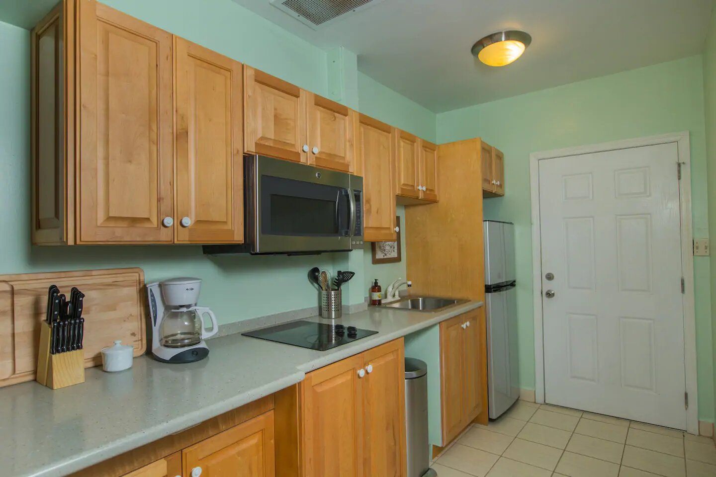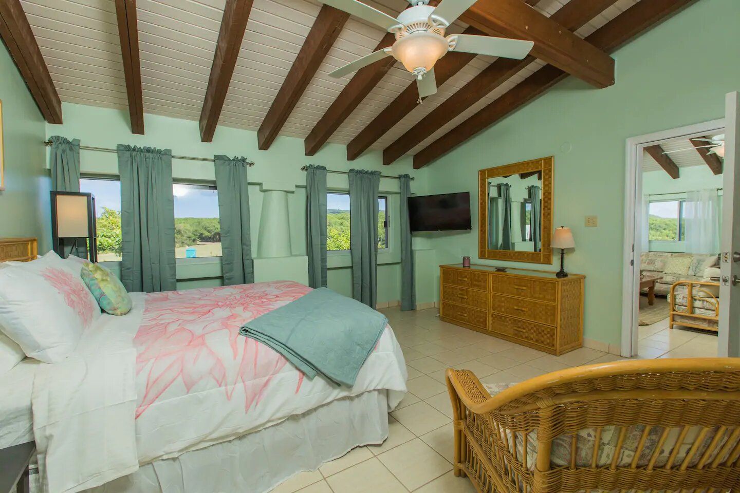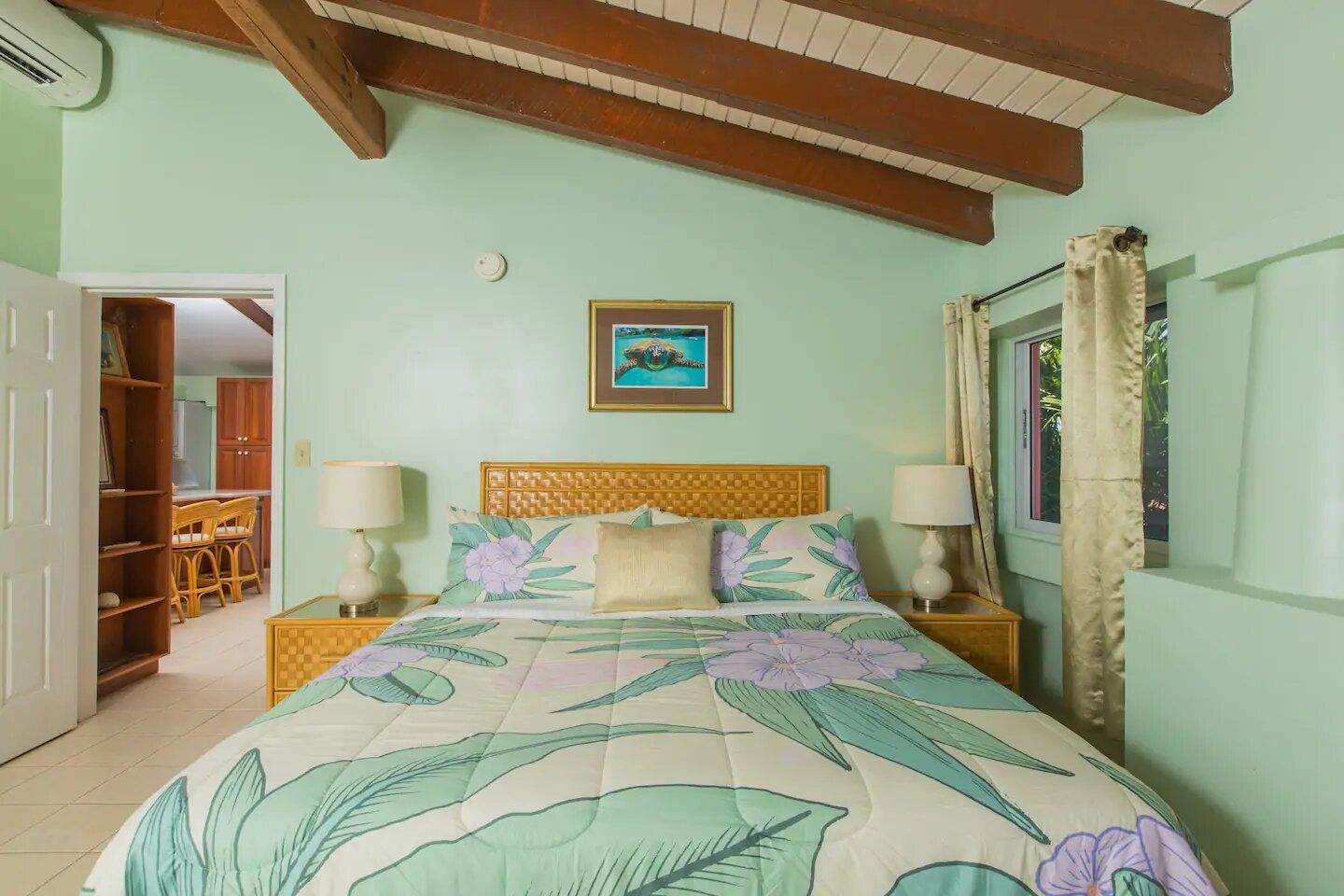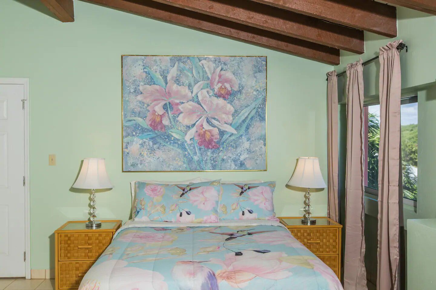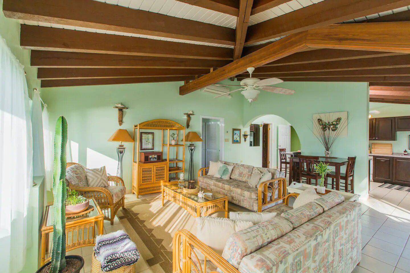 The six residences on the second floor of the Villa Building at Hummingbird Beach Hideaway (HBH) are fully furnished & individually decorated in tropical condo style. The four one-bedroom executive suites & two studios all feature vaulted beamed ceilings & tile floors, with interconnecting double doors through to adjacent rooms which are normally locked but when opened offer a wonderfully spacious & homey flow for family or special events. Each residence is air-conditioned and includes a kitchen area & spacious private bath. Additionally, the one-bedroom executive suites have a spacious sitting area with a private balcony and in the kitchen an Island counter with bar-stool seating, stainless appliances including a full-size range & oven, a refrigerator w/ icemaker, and an in-suite washer/dryer.