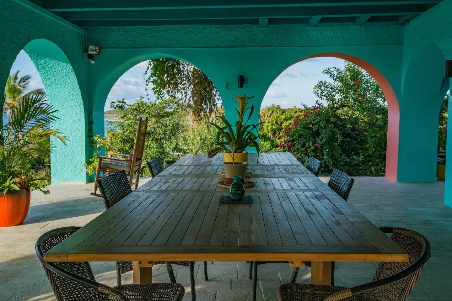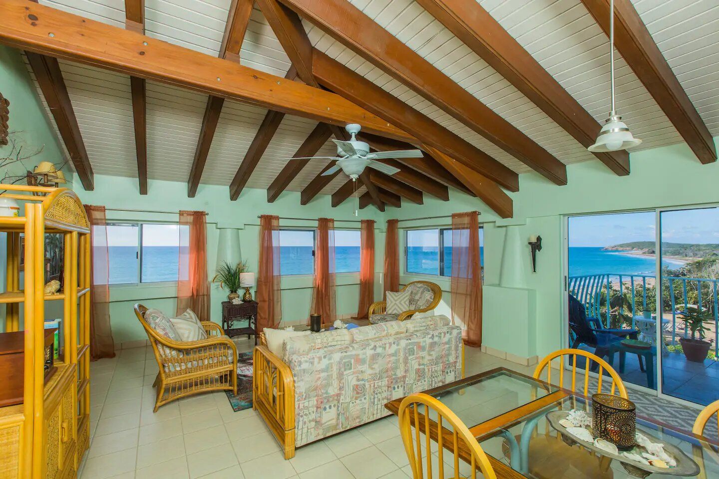 Our Veranda runs all along the Oceanside of the ground floor of the Villa and is a spacious, inviting and relaxing 1,600+ sq foot shaded & breezy gathering space. The Veranda is Oceanside but elevated 30 feet above sea level, providing a magnificent view of the ocean horizon and the beach from point to point on the bay. The Veranda offers a unique venue for a wedding ceremony, reception, meeting or presentation, dinner party or BBQ cookout, or just cocktails & conversation.